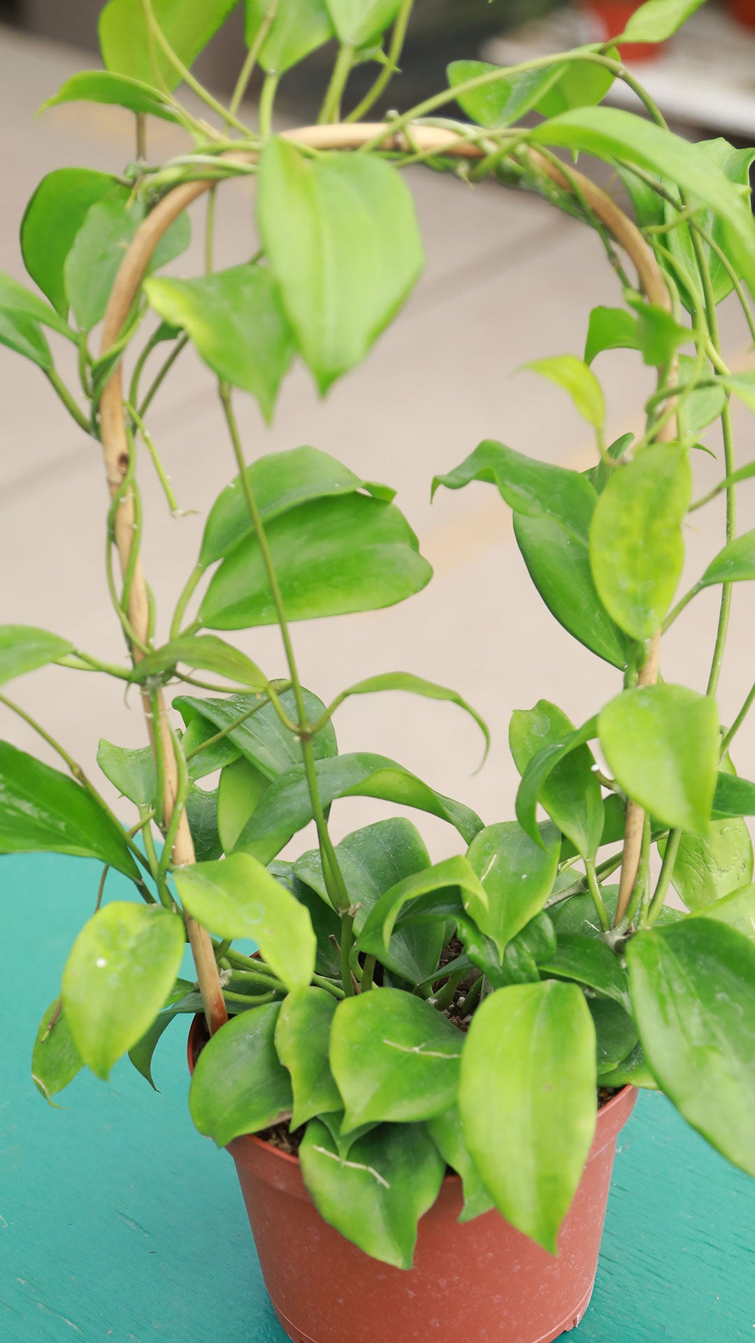 Hoya quinquenervia — a captivating tropical vine admired for its elongated, glossy green leaves etched with subtle veining and a graceful trailing habit. This rare species comes artfully trained on a natural bamboo hoop, adding sculptural beauty and structure to your display. Each vine tells a story of growth and refinement, making it a collector’s treasure for both seasoned plant enthusiasts and modern interior stylists.