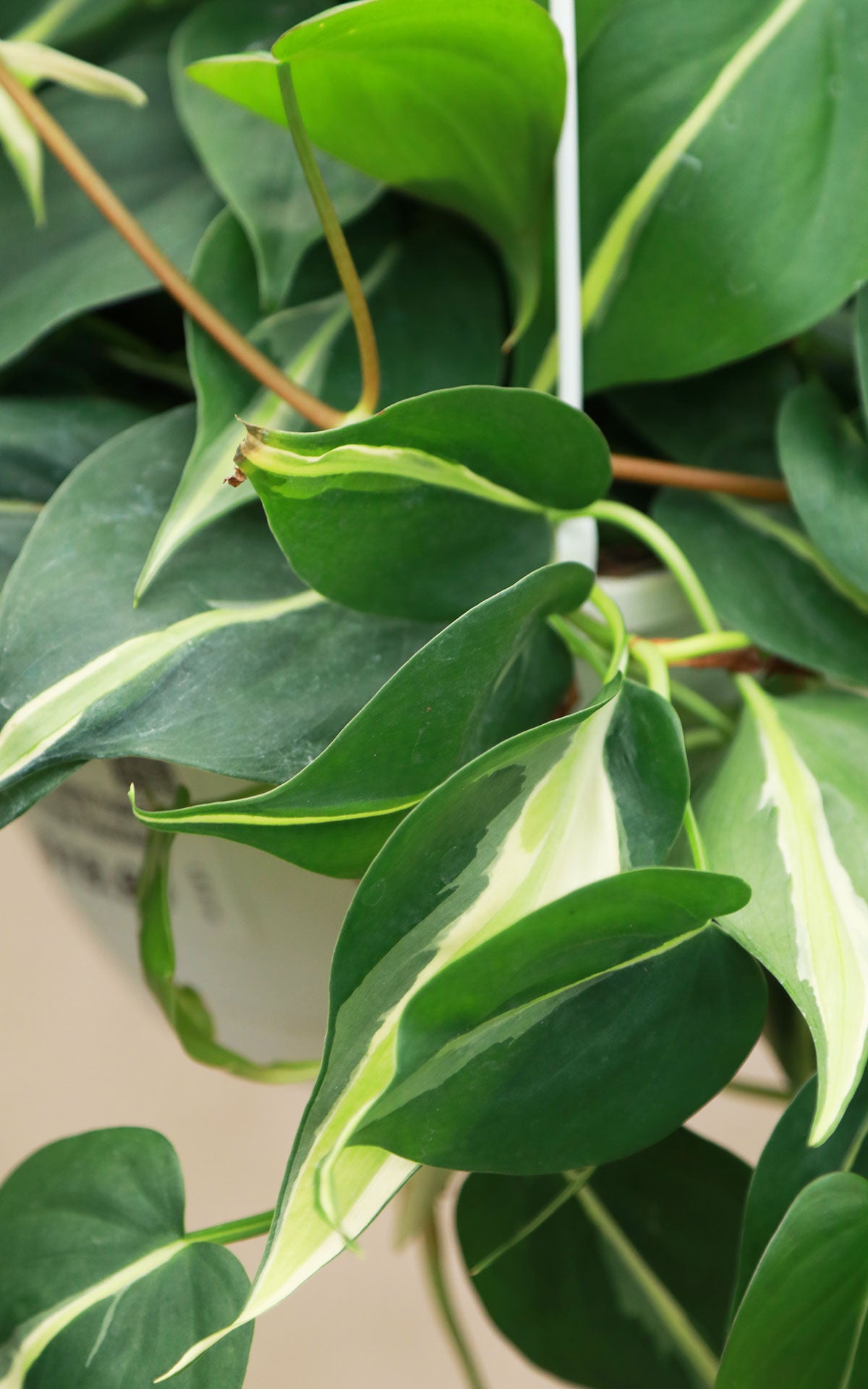 Philodendron ‘Silver Stripe’ is a delicate, eye-catching variety known for its elegant streaks of silvery white running through each leaf. The variegation forms thin, refined lines—sometimes creamy, sometimes cool-toned—that sit beautifully against the rich green foliage. As it trails, the plant creates a soft, cascading look that adds movement and brightness to any room.