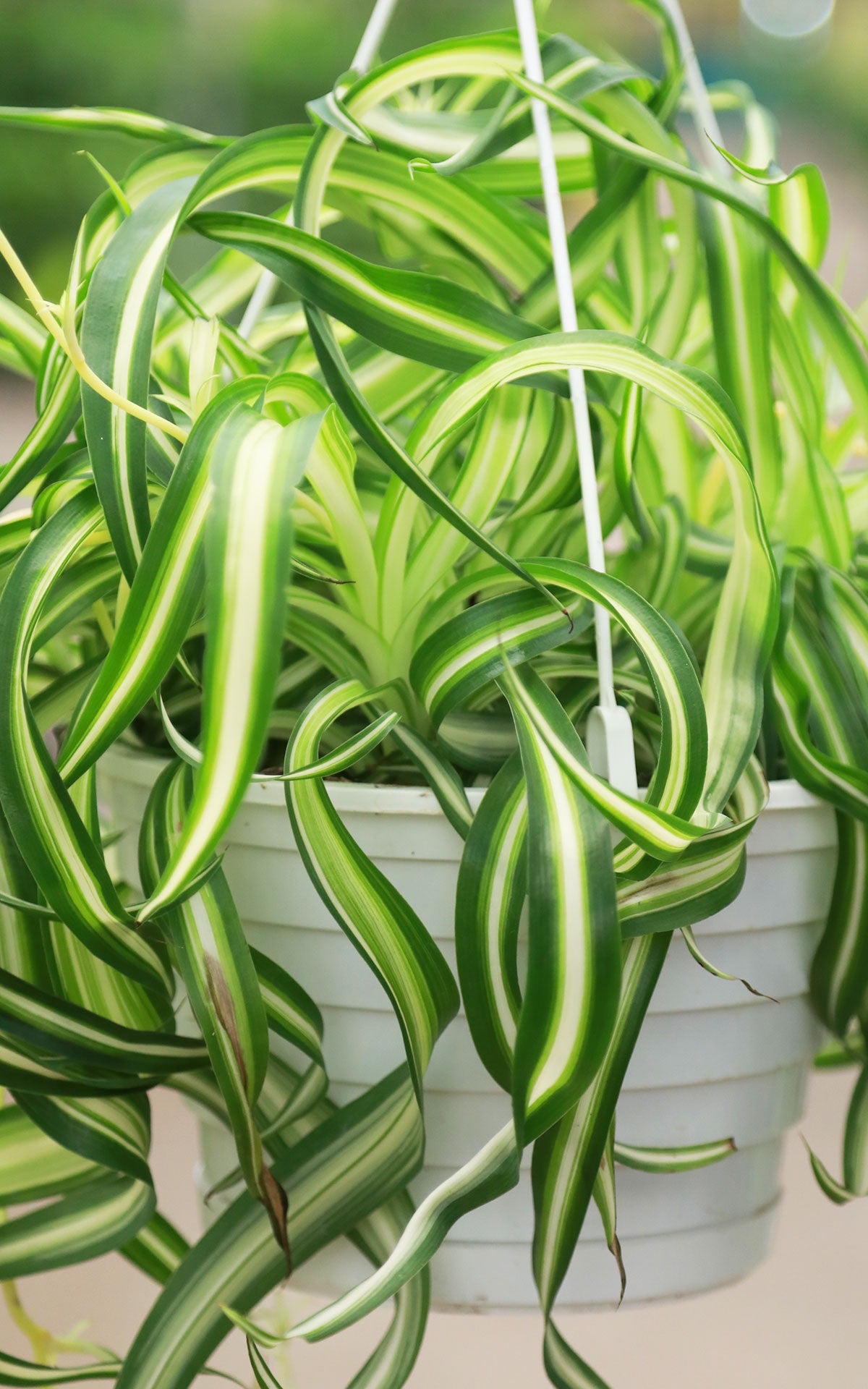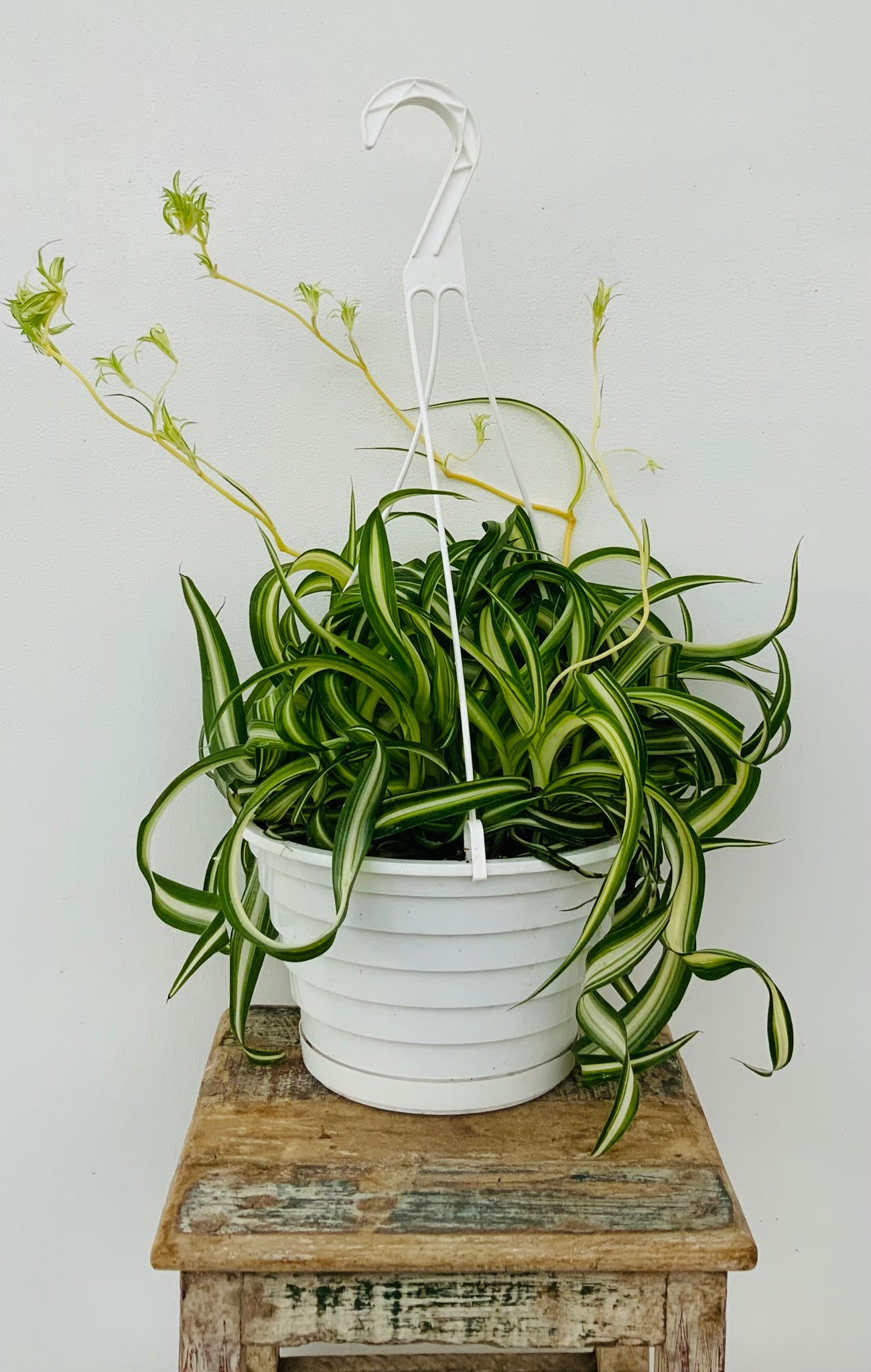 The 8” Curly Spider Plant (Chlorophytum ‘Bonnie’) is a fun, lively twist on the classic spider plant, featuring tight curls, spiraled leaves, and bright green-and-cream variegation. Unlike traditional spider plants, ‘Bonnie’ forms a compact, curly fountain of foliage that makes it perfect for tabletops, plant stands, and hanging baskets.